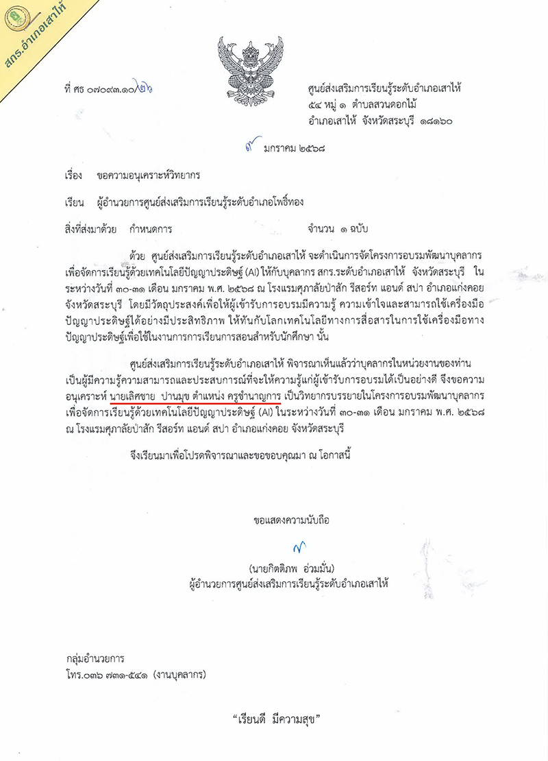 วิทยากรโครงการพัฒนาบุคลากรเพือพัฒนาจัดการเรียนรู้ด้วยเทคโนโลยี AI (สกร.เสาไห้)
