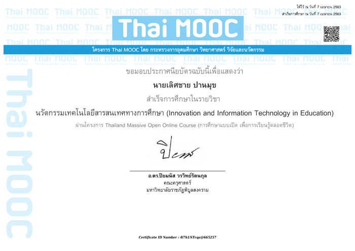 ประกาศนียบัตร (E-Learning) ของ Thai MOOC