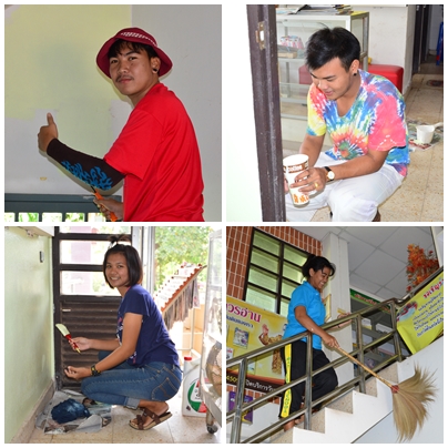 วันที่ 23 ตุลาคม พ.ศ.2558 เด็กๆที่มีจิตอาสานำโดย โอเล่ โด้ เมย์ และ เป้ย มาช่วยทางสีอาคารชั้นล่างตรงห้องเก็บของและห้องน้ำครับ