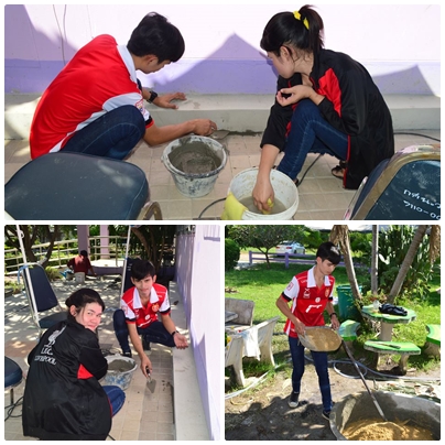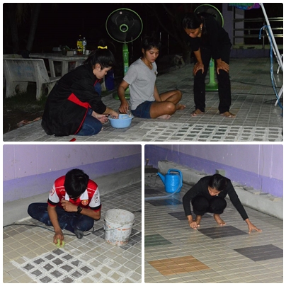 วันที่ 18 พฤศจิกายน พ.ศ.2559 หลังเลิกเรียนมีนักศึกษามาช่วย ได้แก่ เอส ตั้ม และ วันเพ็ญ ช่วยกันผสมปูน ช่วยกันปู ช่วยกันยาแนว โดยมีพี่ใจ ของเราควบคุมการผลิตครับ