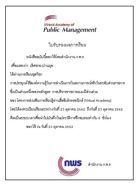 ประกาศนียบัตร (E-Learning) ของสำนักงานคณะกรรมการพัฒนาระบบราชการ (กพร.)