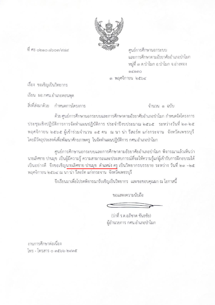 หนังสือเชิญเป็นวิทยากร และช่วยงานราชการที่สำคัญ