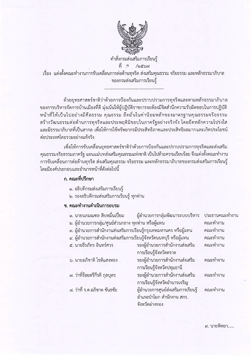 คณะทำงานขับเคลื่อนการต่อต้านทุจริต ส่งเสริมคุณธรรม จริยธรรม และหลักธรรมาภิบาลของกรมส่งเสริมการเรียนรู้