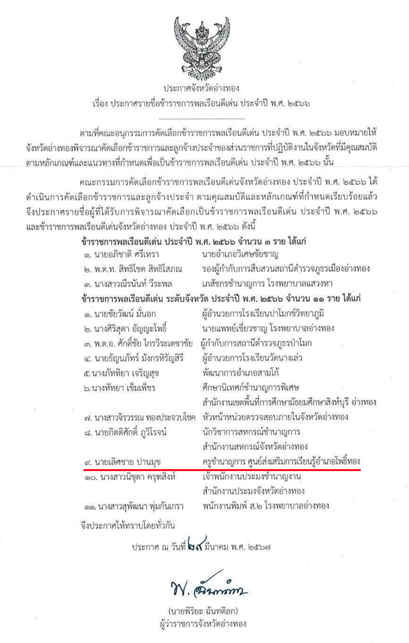 ประกาศรางวัลข้าราชการพลเรือนดีเด่น จังหวัดอ่างทอง ประจำปี 2566