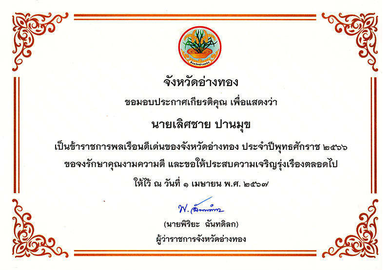 หัวข้อ: รางวัลข้าราชการพลเรือนดีเด่น จังหวีดอ่างทอง ประจำปี 2566 (อ่าน 5754 ครั้ง)