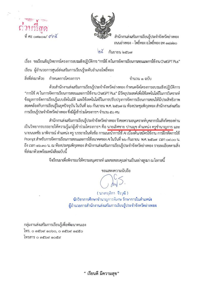 หนังสือเชิญเป็นวิทยากร และช่วยงานราชการที่สำคัญ