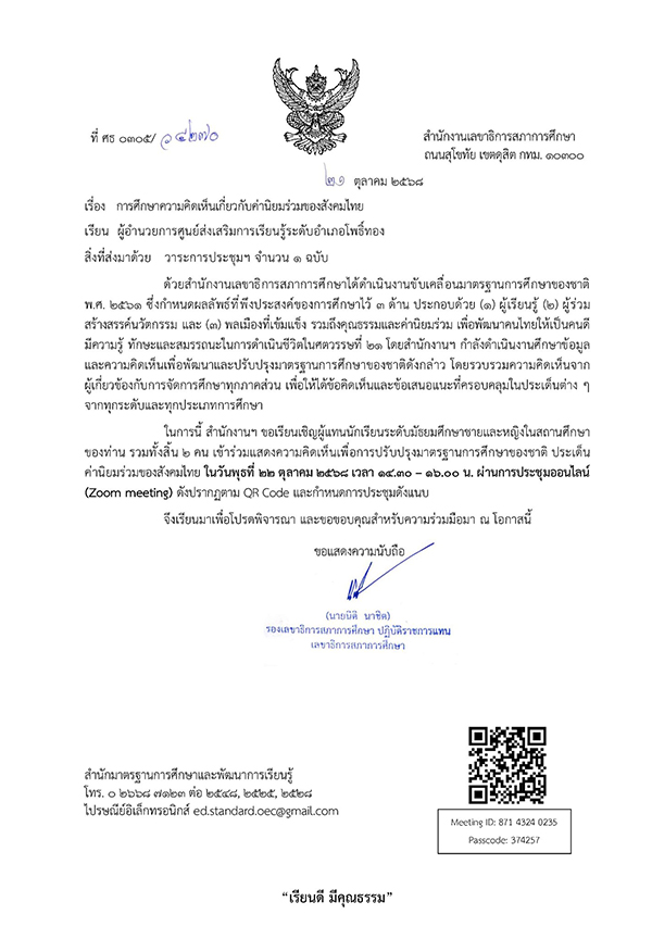 นำตัวแทนนักศึกษาเข้าร่วมประชุมการศึกษาความคิดเห็นเกี่ยวกับค่านิยมของสังคมไทย ของสภาการศึกษา