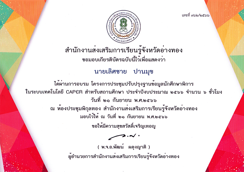 เกียรติบัตร ผ่านการอบรมโครงการปรับปรุงฐานข้อมูลคนพิการ CAPER ปีงบประมาณ 2566